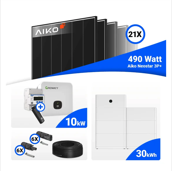 Das 10 kWp PV‑Komplettpaket von Solarhandel24 mit 21× AIKO 490 W Modulen und dem Growatt MOD 10KTL3‑XH BP Hybrid-Wechselrichter vereint Modulleistung, Effizienz und Flexibilität zu einem sehr attraktiven Set. Die AIKO-Paneele liefern mit 490 Watt pro Modul und einem Wirkungsgrad von 24,5 % die beste Leistung der 3 vorgestellten Sets. Die robuste Doppelglas-Technik und N‑Typ-Zellen sorgen außerdem für höhere Erträge – sogar bei diffusem Licht.