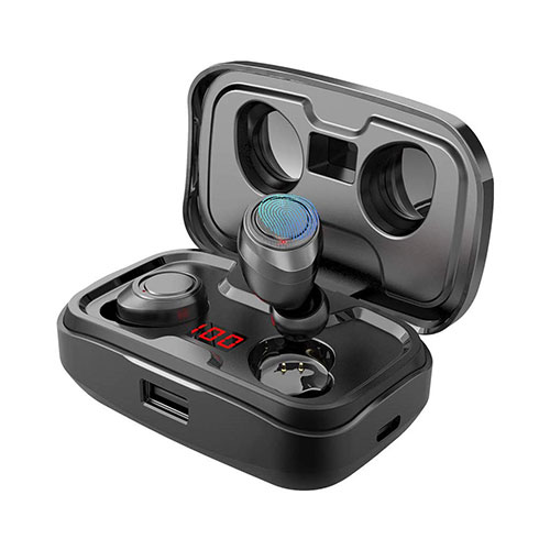 Wasserdichte Wireless Kopfhörer mit 8D-Stereo-Sound und kabelloser Aufladebox mit digitaler Anzeige.