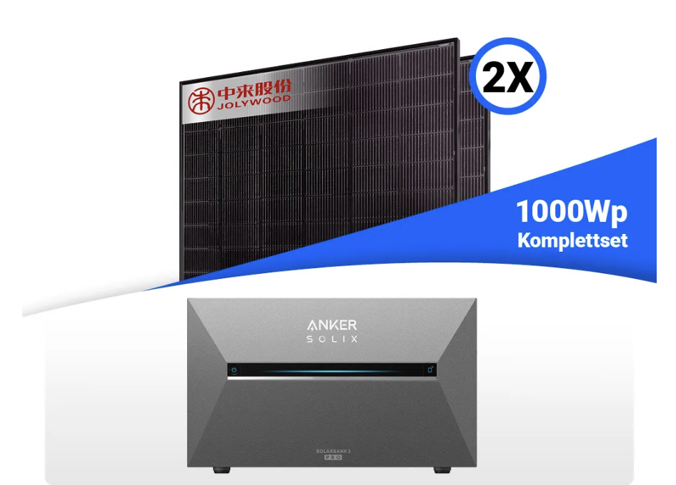 Dieses Plug-&-Play-Komplettset mit 800/1000 W kombiniert zwei bifaziale Jolywood-500-W-Full-Black-Module (N-Typ TOPCon, Glas-Glas) mit der Anker Solix Solarbank 3 Pro (2,7 kWh Speicher) und einem Smart Meter – für bis zu 900 kWh Strom pro Jahr.