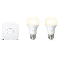 - Zwei Philips Hue White Leuchtmitte: Damit lassen sich bereits zwei Räume mit smarten LED ausstatten. So kann durch eine Varianz der Lichtintensität der Raum in gemütliches warmweißes Licht getaucht werden.