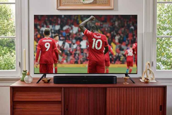 Sonos Beam (2. Gen.) zeigt sich hier aktuell und aufgeräumt. Mit ihrem Längenmaß von zirka 65 Zentimetern ist die Soundbar vor allem für kleinere TVs bis 42 Zoll geeignet, aber natürlich verbessert sie auch den Sound von größeren Modellen, vor allem wenn es sich um günstige TVs handelt, bei denen an den Soundeigenschaften gespart wurde.