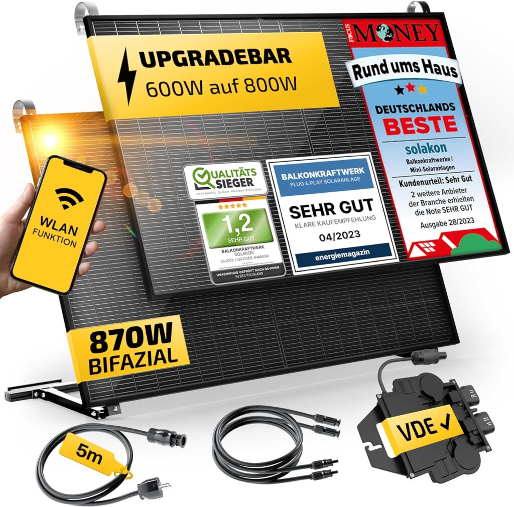 Alle, die nach mehr Leistung suchen, erhalten bei dem ebenfalls von uns sehr gut bewerteten Solakon Balkonkraftwerk für etwas mehr Geld statt nur einem gleich zwei Solarpanele und zusätzlich einen doppelt so starken 800 Watt Wechselrichter.