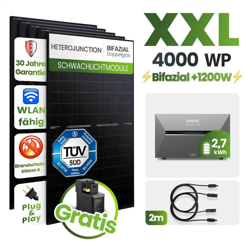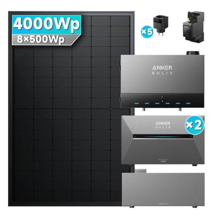 Lieferumfang: 8 x Solarmodul 500 Watt Glas-Glas Full Black bifazial, 8 x Verstellbares Halterungssystem 10-30° für Flachdach/ Wand/ Boden, 1 x Anker SOLIX Solarbank 3 E2700 Pro Speichersystem mit integriertem Wechselrichter und Zusatzbatterien nach Wahl, 1 x Anker Smart Meter, 1 x Anker-Anschlusskabel mit Schuko-Stecker (3m) + optional 15m Anschlusskabel wählbar, 8 x Paar MC4 Verlängerungskabel 5m (4mm²), 4 x Y-Stecker, weitere Zubehör nach Wahl